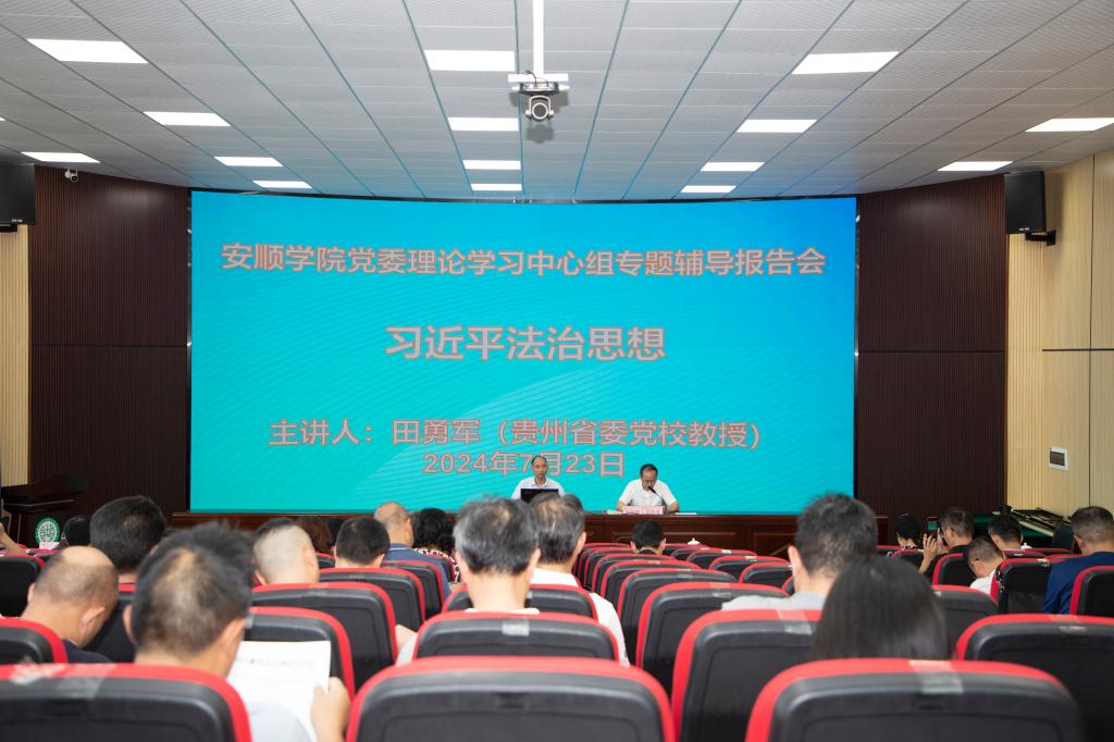 2024年7月23日,安顺学院召开党委理论学习中心组(扩大)集中学习会议暨专题辅导报告会,会议分为两个阶段进行,第一阶段是贵州省委党校教授田勇军作“习近平法治思想”专题辅导报告,第二阶段是集中学习,安顺学院党委书记罗荣彬主持会议并提出要求。校党委委员、校领导,全体正副处级干部参加会议。
