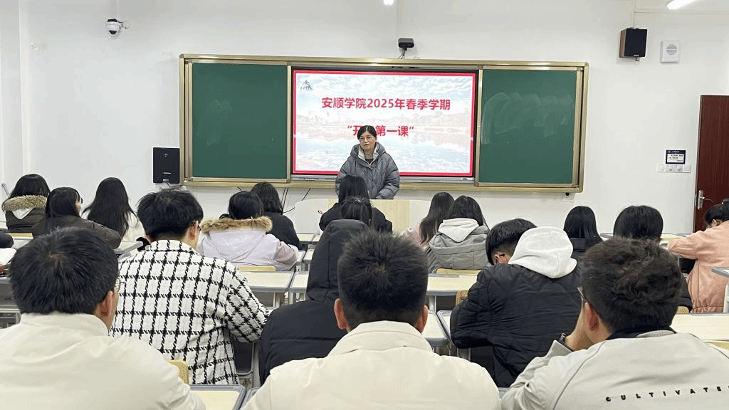 2025年3月14日上午,安顺学院党委委员、副校长韦英在顺理楼4-12教室为经济与管理学院2022级农区班学生讲授“开学第一课”。