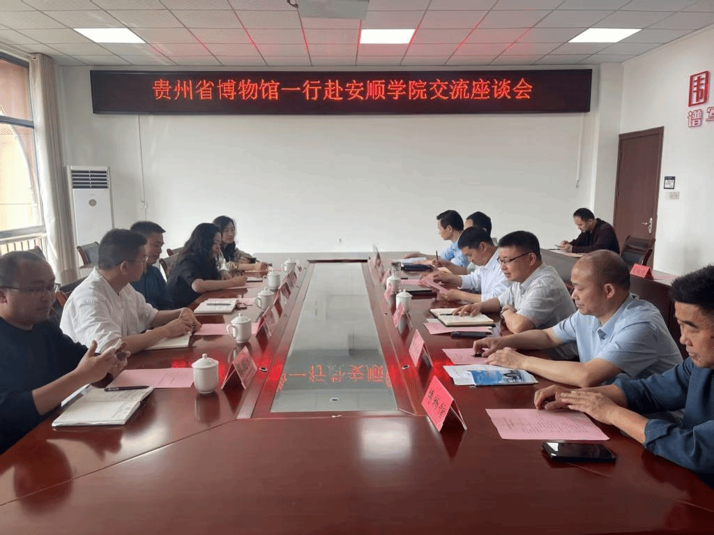 2025年5月21日,贵州省博物馆党委书记李强、副馆长向青一行到安顺学院座谈交流。安顺学院副校长张来,党委委员、副校长杜志明,党政办、发展规划处、对外交流与合作处、教务处、科研处、艺术学院、人文学院、博物馆等部门负责人及代表出席座谈交流会。座谈会由杜志明副主持。