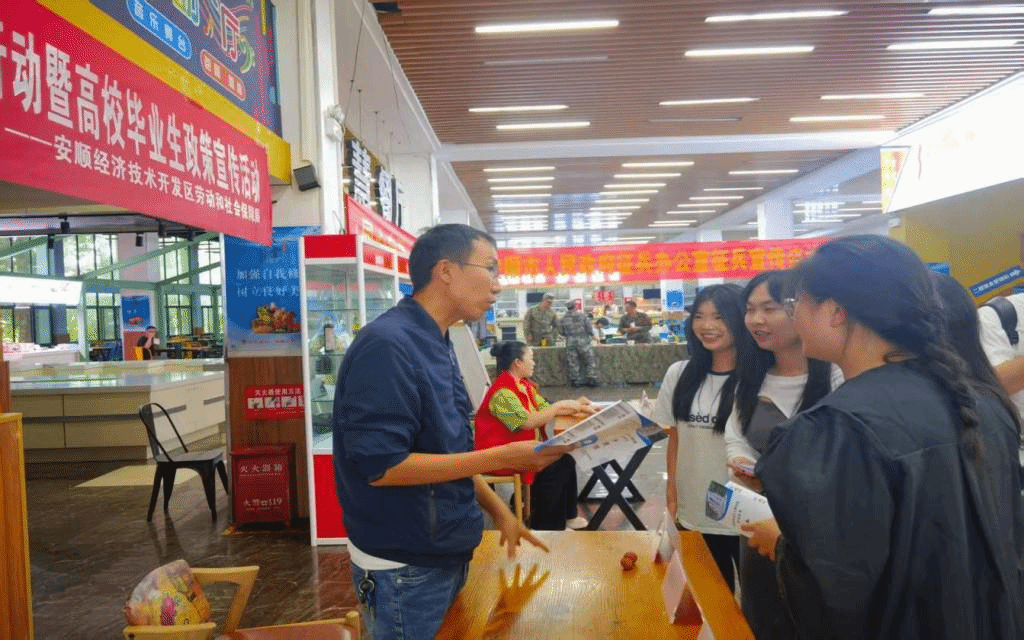 2025年6月19日上午,安顺学院在清风里食堂举办就业政策宣传解读活动。活动由安顺学院招就处、安顺市教育局、安顺经开区劳动和社会保障局联合举办,安顺市东西部协作高校毕业生职业指导服务站承办。我校利用2025届毕业生返校领证“毕业冷餐会”的有利时机,为2025届毕业生开展了最后一次就业教育和就业指导活动。
