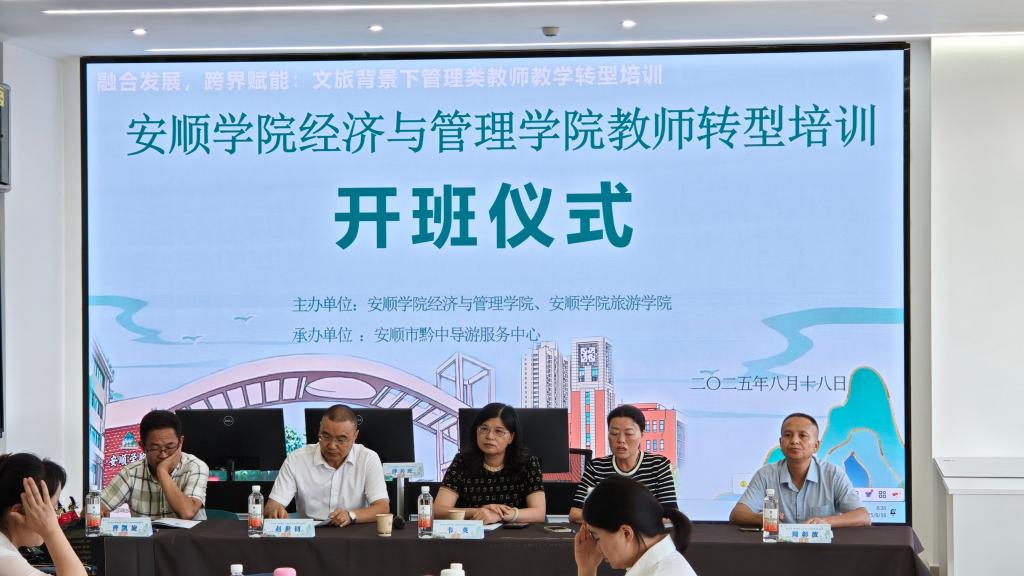 2025年8月18日上午,由安顺学院经济与管理学院组织的“融合发展,跨界赋能:文旅背景下管理类教师教学转型培训”在实验楼文旅大数据教室正式开班。安顺学院副校长韦英出席并致辞。学院班子成员及全体参训教师参加仪式。开班仪式由学院党委书记张红霞主持。