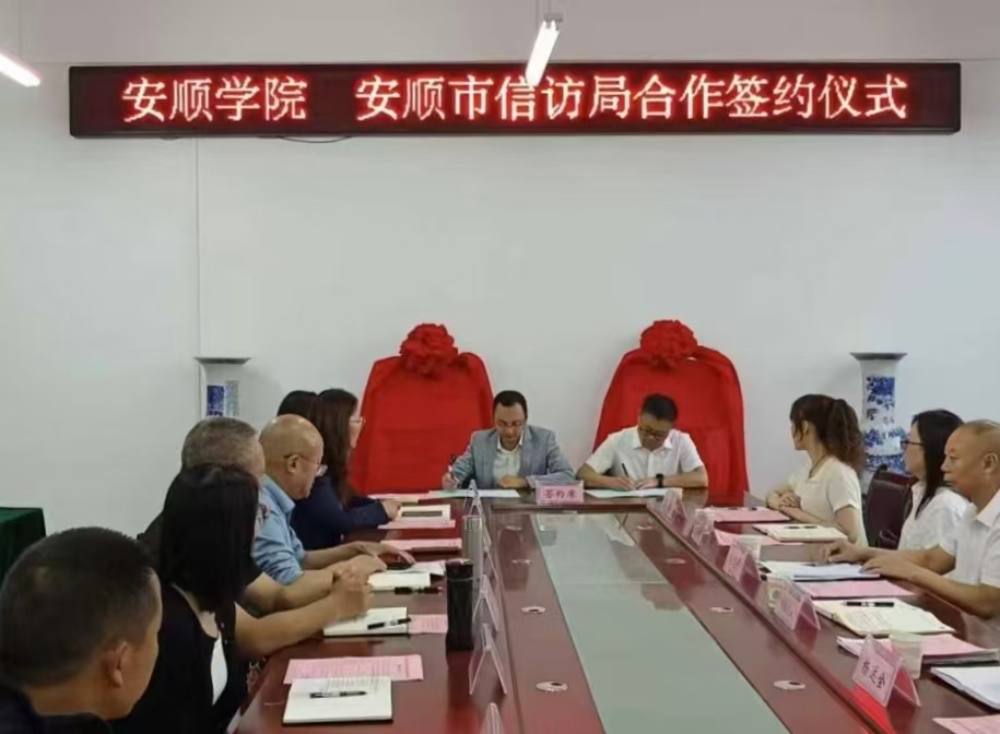 签约暨揭牌仪式在安顺学院政法学院会议室举行。安顺市信访局局长马照亮、副局长令狐克斌,安顺学院对外交流与合作处处长王旭,安顺学院政法学院院长徐忠、党委专职副书记尹科等出席活动。仪式由王旭主持。