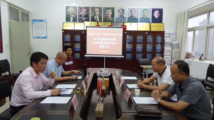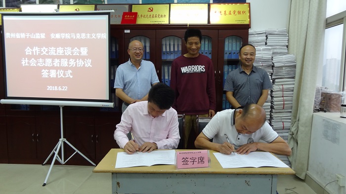 6月22日上午,贵州省轿子山监狱与安顺学院马克思主义学院合作交流座谈会暨社会志愿者服务协议签署仪式在马克思主义学院会议室举行。贵州省轿子山监狱党委委员、副监狱长胡昌伦、监狱教育改造科科长黎益勇、监狱教育改造科副科长张涛、马克思主义学院党总支书记黎进深、马克思主义学院院长徐忠、马克思主义学院副院长张信通和相关科室负责同志参加,座谈会和签署仪式由马克思主义学院院长徐忠主持。
