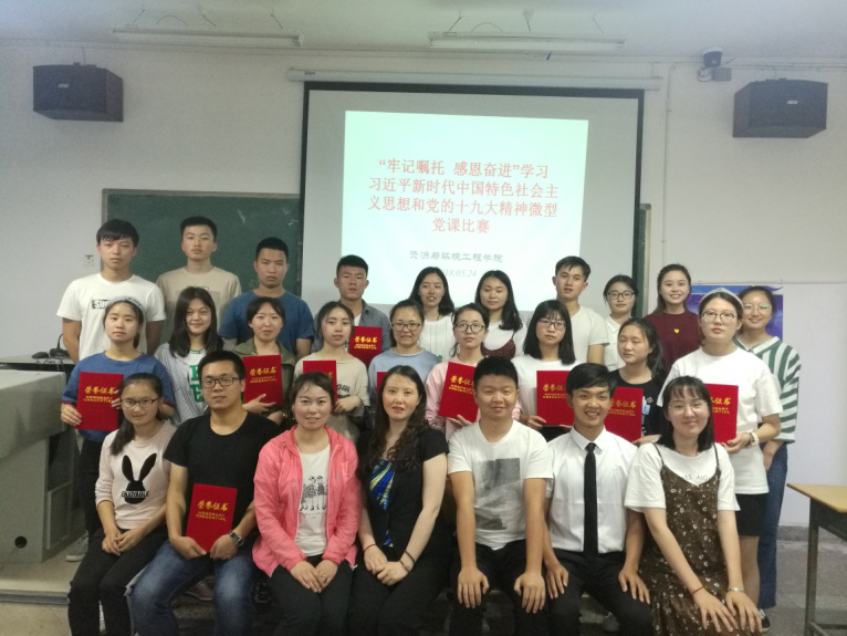 为增强大学生党员的政治意识、大局意识、核心意识、看齐意识。资环学院于2018年5月24日在0843教室举行了主题为“牢记嘱托·感恩奋进”学习习近平新时代中国特色社会主义思想和党的十九大精神的微型党课比赛。我院4个专业的24名参赛选手精心制作了PPT课件,生动形象的情景展示,充分显示出当代大学生积极弘扬社会主义核心价值观,牢固树立党的政治意识、大局意识。经过激烈的比赛,2016土管班的菅政博同学,课件从一个新思想、一个新观点、宣传党的十九大精神,字正腔圆、言语生动、主题明确,赢得了哗然的掌声,也荣获了该次比赛一等奖,徐衡、张悦获得二等奖,刘珏丹、任博、张红霞获得三等奖。