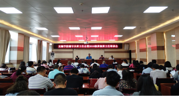 8月31日下午,安顺学院辅导员班主任会暨2018级班级班主任培训会在西校区特教大楼七楼会议室召开。学工部副部长鲁小周、张明莉,招生就业处副处长罗瑜,团委组织部部长谌兰樱,全校在岗专职辅导员和2018级新生班级班主任以及学工部相关科室工作人员参加会议。