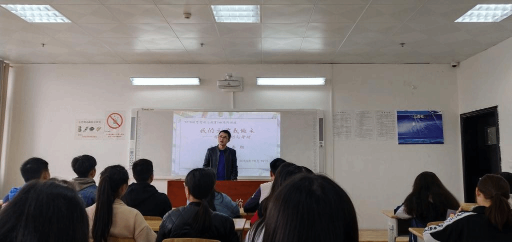 为了让大一新生尽快转变角色,适应大学生活,了解所学专业,加深对考研的认识,增强考研信心,2018年10月19日下午,政法学院2018级思想政治教育一班在特教楼0709教室举办了以“我的大学我做主”为主题的学业规划和考研讲座。讲座由马克思主义学院秦朗老师主讲,班主任祝元梅老师主持。