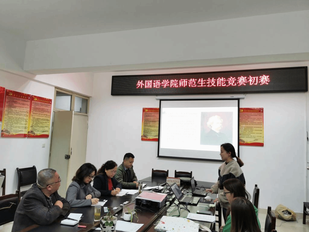为全面提升师范生专业素养和职业技能,11月6日下午,安顺学院外国语学院在新教学楼7楼会议室举办安顺学院师范生教学技能大赛初赛。外国语学院党委书记曲建新、院长蒋燕、副院长曾沉、教务科科长肖德铭、教研室主任张囷担任此次比赛的评委。