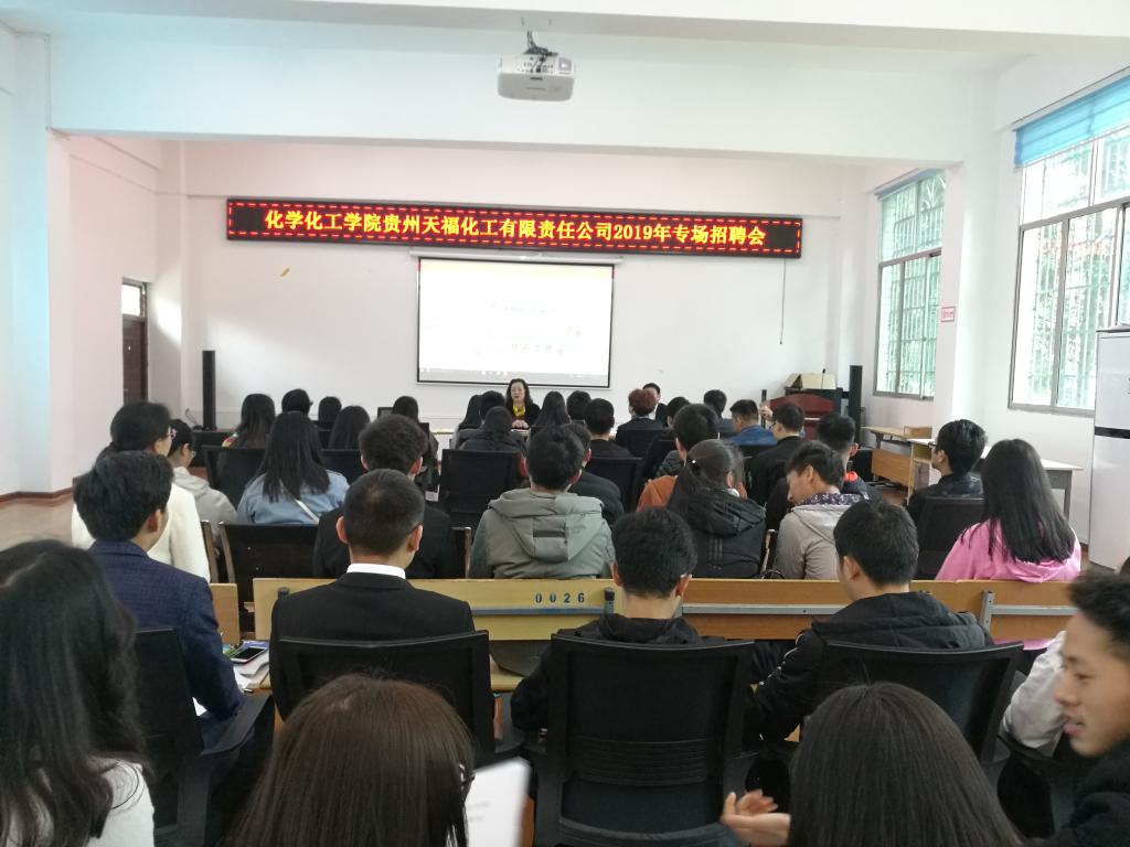 2019年3月28日下午,贵州天福化工有限责任公司2019年专场招聘会在安顺学院化学化工学院举行。化学化工学院党委书记杨莉莉、学生科教师秦兰、2015级化学工程与工艺班班主任刘青、2016级化学工程与工艺班学生以及2015级化学工程与工艺和化学专业学生参加招聘会。
