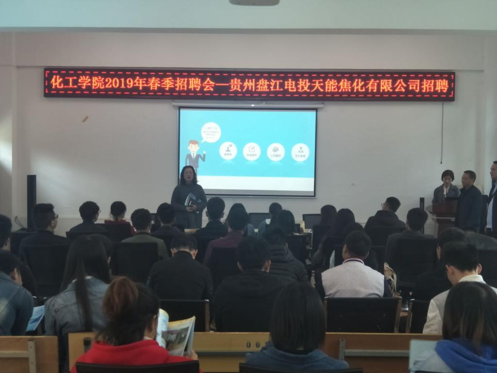 2019年3月29日上午,贵州盘江电投天能焦化有限公司专场招聘会在化学化工学院举办,化学化工学院党委书记杨莉莉、学生科教师秦兰、2015级化学工程与工艺班班主任刘青以及2015级化学工程与工艺和化学专业学生参加了本次招聘会。