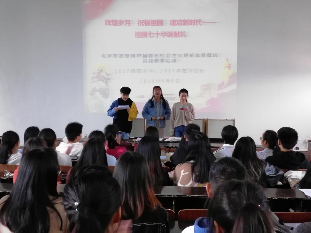为了进一步提升思政课实践教学实效,5月9日下午,马克思主义学院在电教楼951教室举行本学期思政课实践教学公开观摩活动。全体思政课教师集中观摩了郝彩平老师在17级美术学和艺术设计学《毛泽东思想和中国特色社会主义理论体系概论》课程中开展的“辉煌岁月•祝福祖国•建功新时代——祖国70华诞献”主题实践活动。