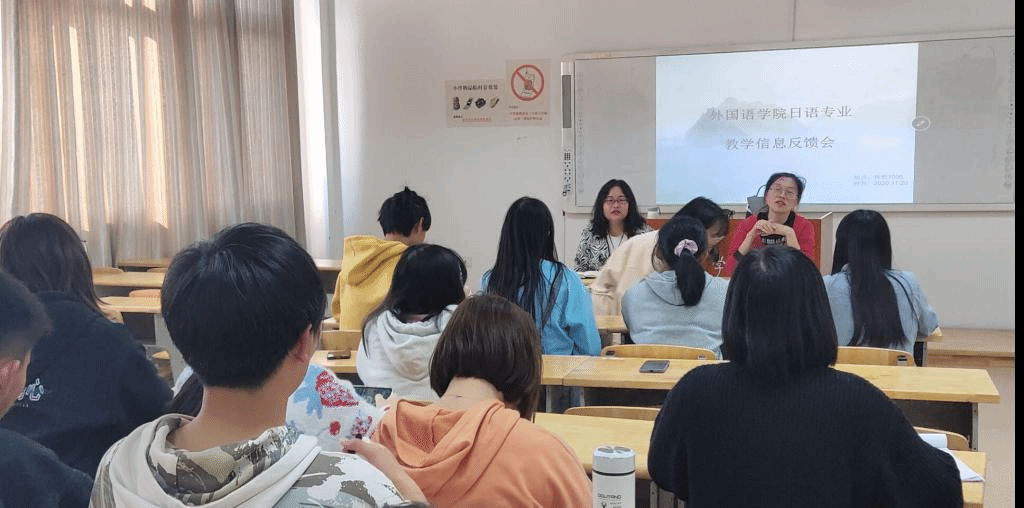 2020年11月20日下午,外国语学院日语专业在特教大楼1006教室召开教学信息反馈反馈会,外国语学院副书记刘碧芬,日语教研室主任韩琦及2018级、2020级日语本科班学生代表参加。