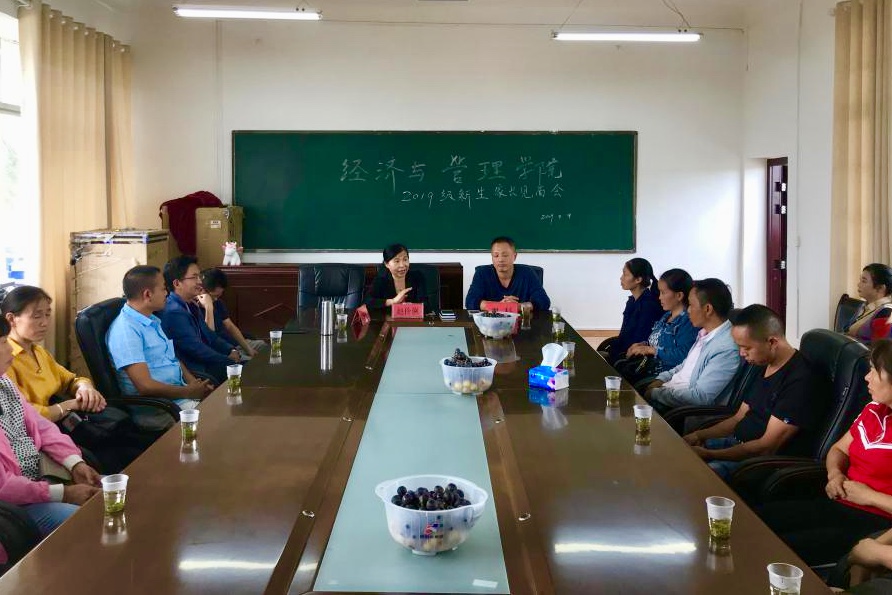 2019年9月9日下午,经济与管理学院在党员活动室举行了2019级迎新生家长座谈会。经济与管理学院党委副书记、院长赵伶俐、经济与管理学院专职副书记尹科、经济与管理学院办公室主任曹凯旋、经济与管理学院教学与实践管理科科长邓增强、各教研室主任及辅导员参加本次座谈会。