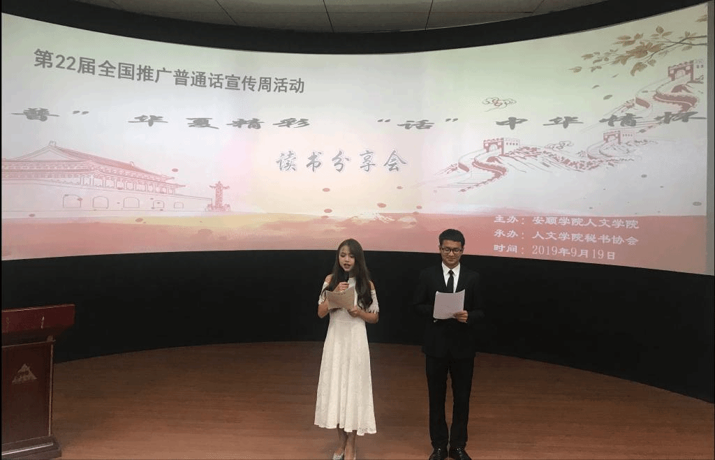 2019年9月19日,人文学院在旅游学院实训室成功举行了第22届全国推广普通话宣传周主题活动——“‘普’华夏精彩,‘话’中华情怀”读书分享会。人文学院院长胡赤兵,辅导员李聚刚老师出席了本次活动。