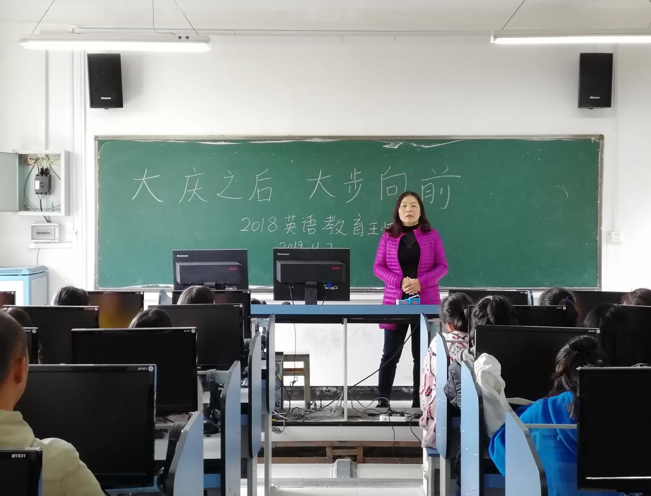 2019年11月7日下午,外国语学院2018级英语教育专科班召开“大庆之后,大步向前”主题班会,安顺学院党委宣传部部长殷红敏作为班级导师出席本次主题班会。