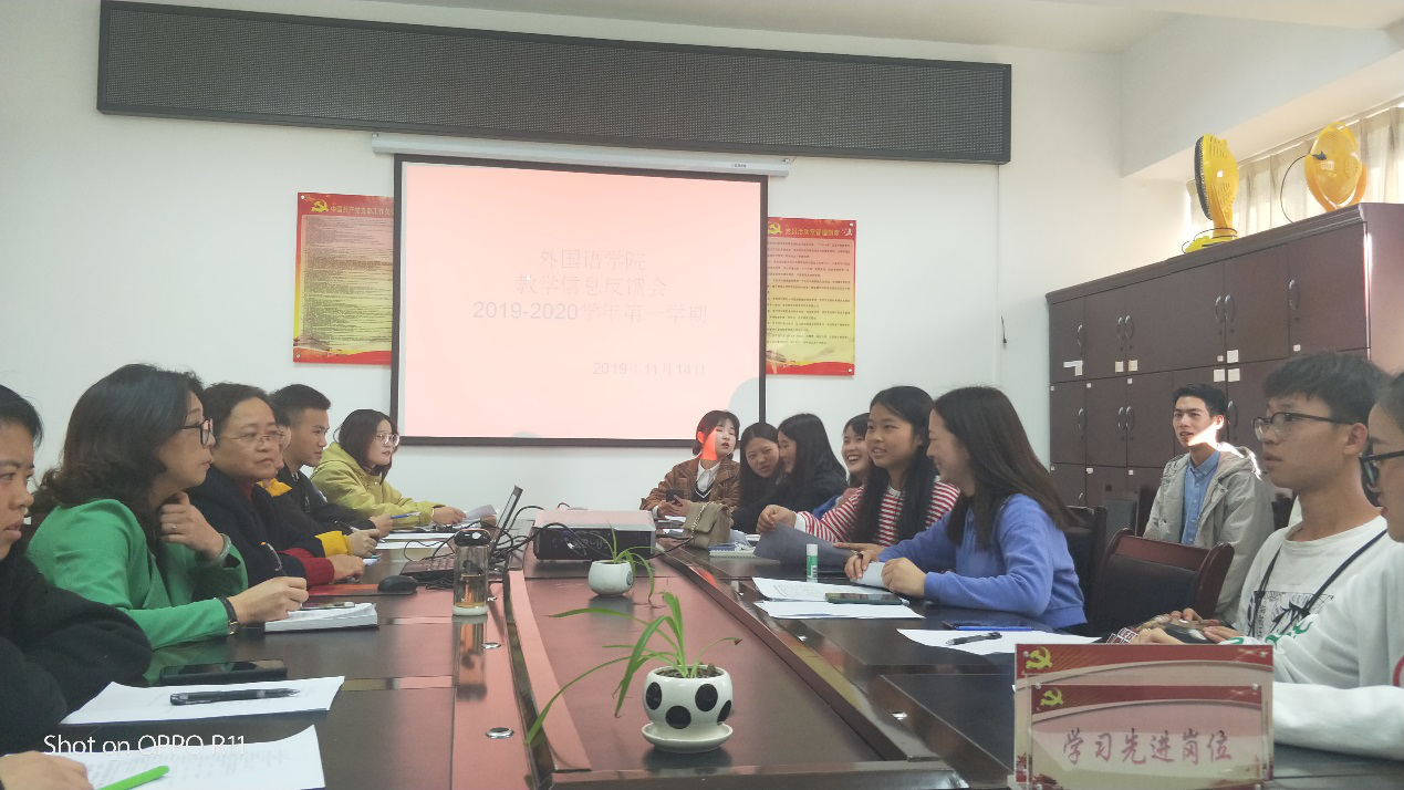 11月14日,外国语学院英语专业学生信息反馈会在外国语学院会议室召开,外国语学院院长蒋燕、副院长曾沉、教研室主任张囷出席会议。