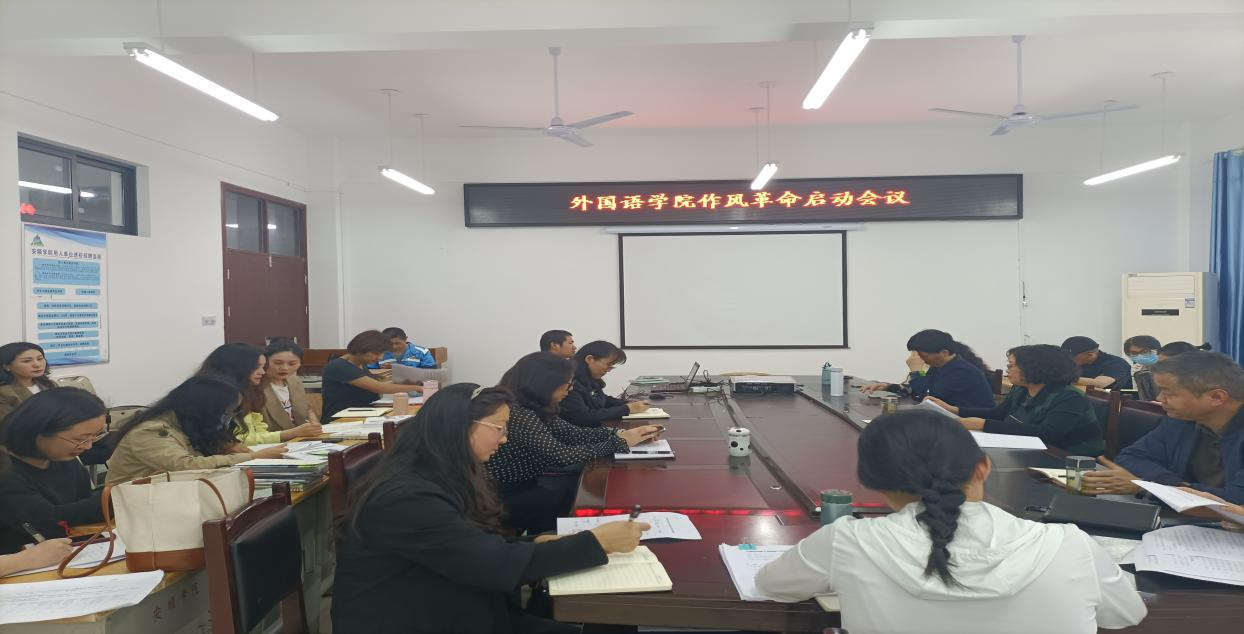 为深入学习贯彻全市作风革命启动大会精神,外国语学院2022年4月25日下午组织全体教职工召开“外国语学院作风革命启动大会”,外国语学院院长蒋燕主持会议。