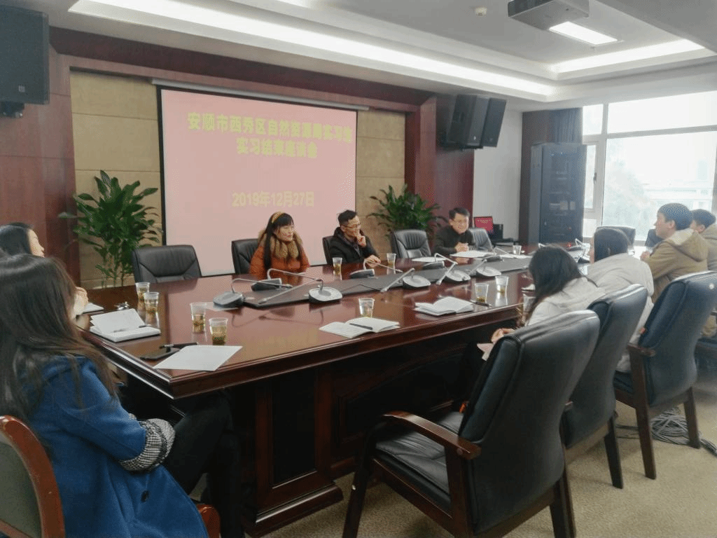 2019年12月27日上午,安顺学院资源与环境工程学院副书记张玉涛、土地资源管理专业教研室主任兼实习带队教师殷清慧赴安顺市西秀区自然资源局参加2016级土地资源管理专业集中实习总结座谈会。安顺市西秀区自然资源局副局长朱明、各科室负责人和全体集中实习生进行了座谈交流。