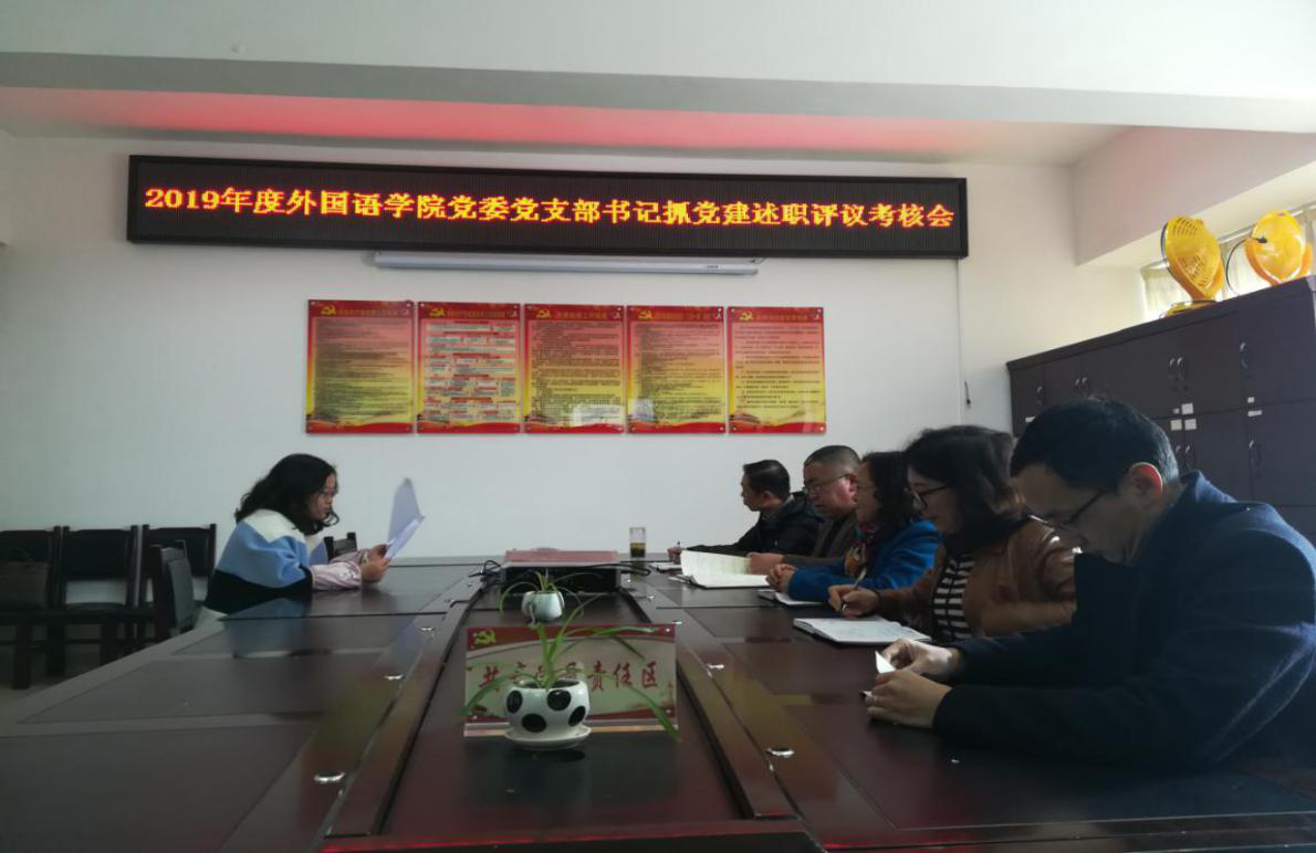 2020年1月9日上午,外国语学院党委在党员活动室召开2019年度支部书记抓党建述职评议考核会,外国语学院党委班子成员和相关工作人员参加会议,会议由外国语学院党委书记曲建新主持。