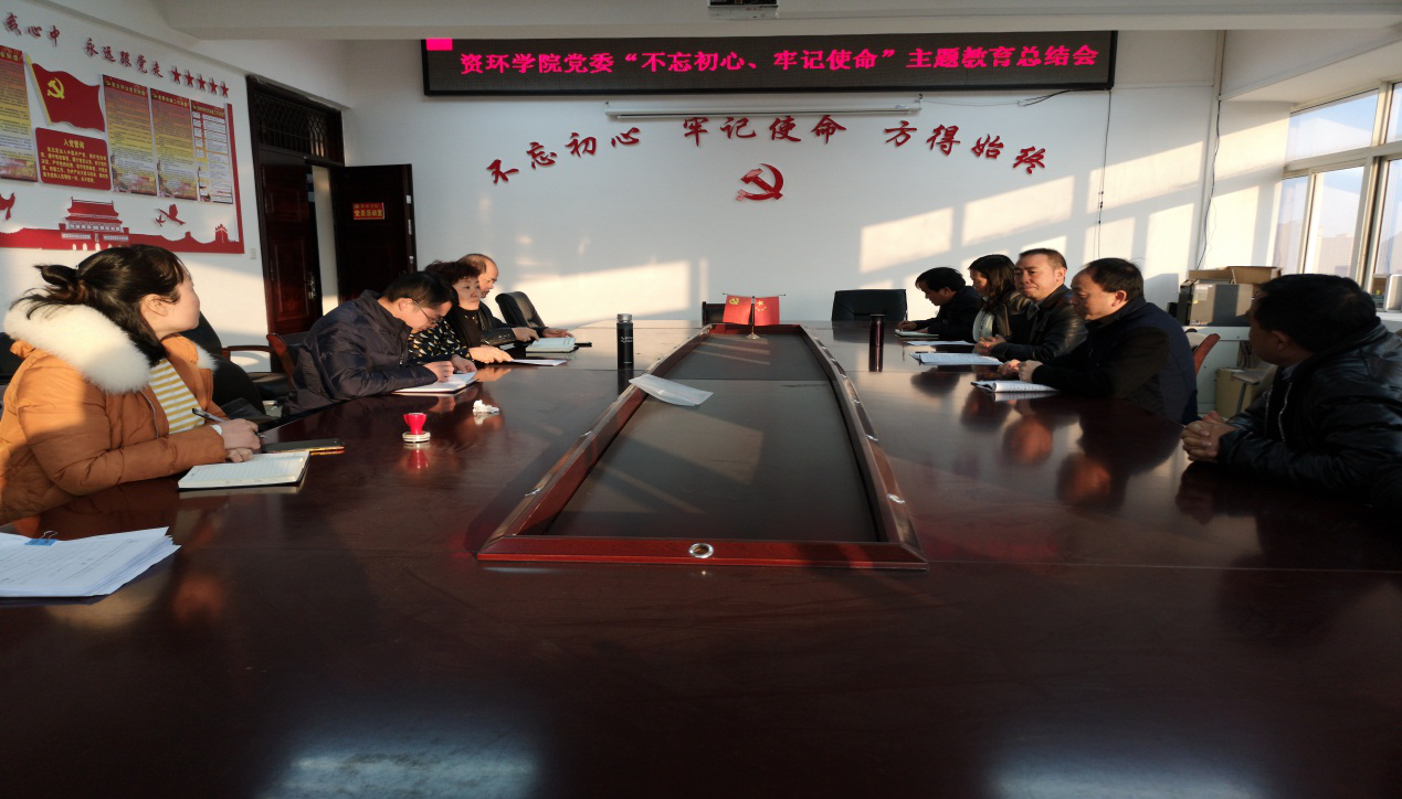 2020年1月11日下午,资环学院党委召开“不忘初心、牢记使命”主题教育总结大会,资环学院副科级以上干部、学校“不忘初心、牢记使命”主题教育第六巡回指导组同志参加此次会议。会议由学校“不忘初心、牢记使命”主题教育第六巡回指导组成员李仕蓉主持。