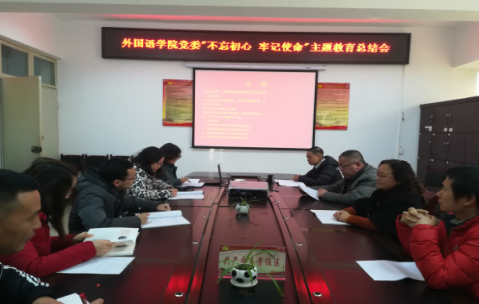 为认真贯彻落实中央、省委、市委及学校党委“不忘初心、牢记使命”主题教育总结大会精神,全面总结外国语学院主题教育的经验成效,进一步巩固深化主题教育成果,加强“不忘初心、牢记使命”制度建设,持续推动整改整治工作保持常态化、形成长效机制。 2020年1月11日下午,外国语学院党委召开“不忘初心、牢记使命”主题教育总结会。外国学院党委班子成员,外国语学院“不忘初心、牢记使命”主题教育指导小组全体成员参加。会议由外国语学院党委副书记刘碧芬主持。