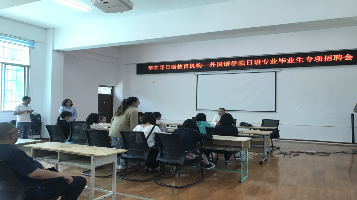 2020年6月3日下午14点30分,我校外国语学院组织召开专场招聘会。贵州芊芊寻教育咨询有限公司在安顺学院招聘大厅针对安顺学院外国语学院日语专业毕业生进行人才招聘。安顺学院外国语学院党委书记曲建新、副院长刘碧芬出席会议。