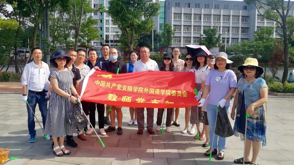 第二阶段,外国语学院全体党员教师以“勇做志愿表率·为党旗增辉”为主题,充分发挥党员的先锋模范带着作用,深入娄湖公园管理处,开展卫生清洁、文明行为劝导等工作,为推动安顺市全国文明城市创建工作助力。(文/图:外国语学院 流江涛)