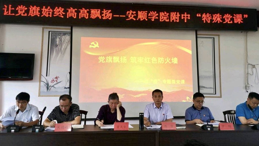 本次会议分为两项:一是开展“党旗飘扬 筑牢红色防火墙”——安顺学院附中基层党组织战“疫”专题微党课;二是开展“庆党的生日、悟初心使命”主题党日活动。