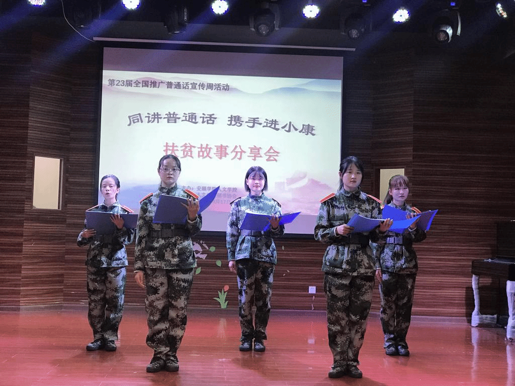活动围绕本届推普周主题“同讲普通话,携手进小康”展开了扶贫故事分享会,节目形式多样,精彩纷呈,有诗歌朗诵、故事讲解、情景剧等。同学们在观看和聆听的过程中,不仅被感人的扶贫故事深深打动,从中了解到国家的诸多扶贫政策,还充分认识了推普扶贫的重要性。
