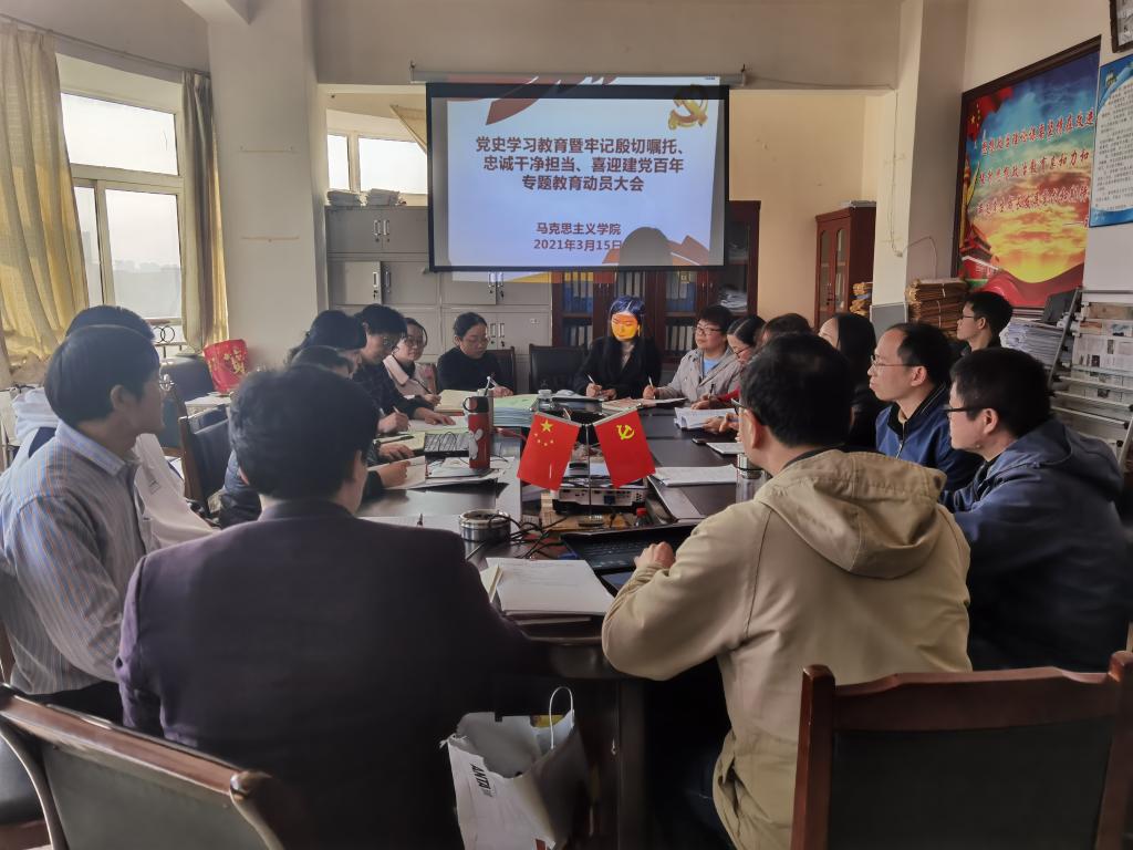 为了从党的百年伟大奋斗历程中汲取继续前进的智慧和力量,深入学习贯彻习近平新时代中国特色社会主义思想,巩固“不忘初心、牢记使命”主题教育成果,激励全党全国各族人民满怀信心迈上全面建设社会主义现代化国家新征程,2021年3月15日下午,马克思主义学院在会议室召开党史学习教育暨牢记殷切嘱托、忠诚干净担当、喜迎建党百年专题教育动员大会,会议由院长黎进深主持,全体教师参加会议。