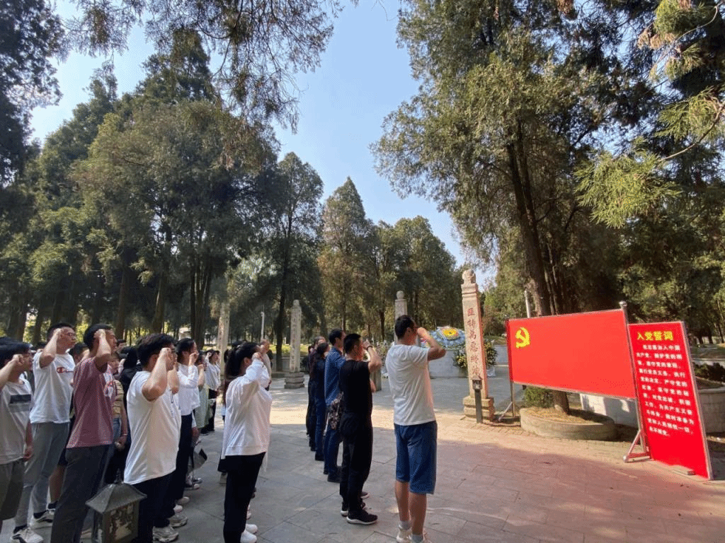 在庄严的烈士陵园纪念碑前,全体人员肃穆而立,向革命烈士默哀,怀着崇敬的心情瞻仰革命烈士并敬献鲜花。人文学院教师党员代表孙利玲、曾烁分别作活动发言,表示要把党的历史学习好、传承好、发扬好。接着,全体党员面对鲜红的党旗,重温入党誓词,表达对革命烈士的崇高敬意。最后,杨明作总结讲话,他要求全体党员要深刻认识党史学习教育的重要意义。要通过生动的党史学习教育深化对党史的理解,继承和弘扬好光荣革命传统,将其贯彻到工作学习中,摆正人生坐标,肩负起时代使命。