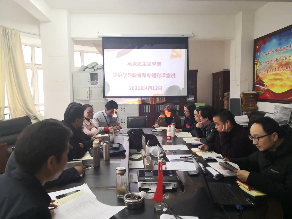 为深入学习贯彻习近平总书记在党史学习教育动员大会上的重要讲话精神以及罗荣彬书记在全校党史学习教育动员大会上相关要求,扎实有效开展党史学习教育,2021年4月12日下午,马克思主义学院开展党史学习教育和专题党课宣讲活动,此次活动由学院党委书记王罡同志主讲,全体党员教师聆听了专题党课。