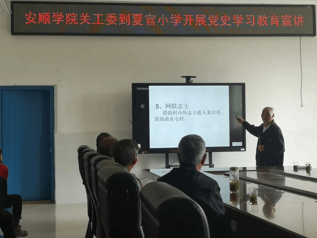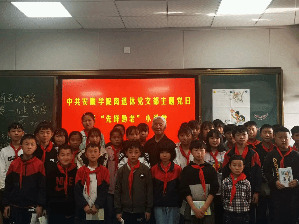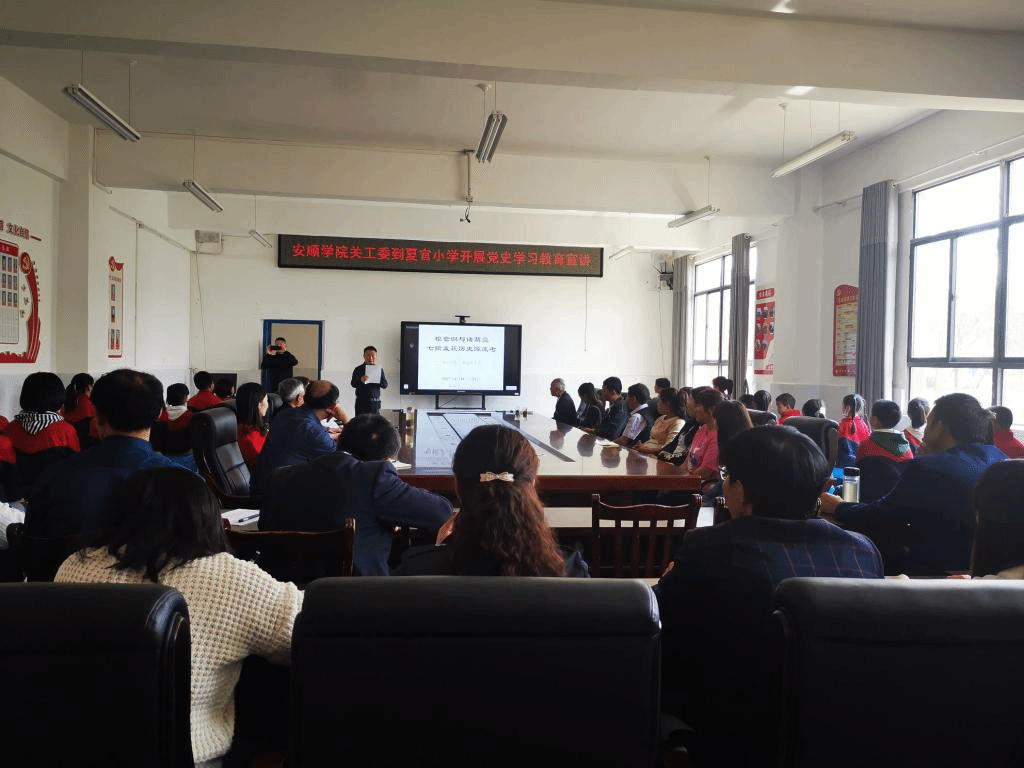当前,正值党史学习教育和“牢记殷切嘱托、忠诚干净担当、喜迎建党百年”专题教育之际,为深入贯彻学习习近平总书记关于党史学习教育的重要指示精神,按照省、市老干局及省、市教育系统关工委相关精神,4月21日,安顺学院离退休党委组织校关工委老同志到安顺市西秀区七眼桥镇夏官小学开展党史学习教育暨“先锋黔老”小讲堂活动。离退休党委书记刘颖、离退休党委委员副处长陈剑康、肖晓春及学校派驻清水屯村第一书记卢书章,校关工委常务副主任杨通邦、副主任潘发义、艺术学院关工委副主任赵庆玺、离退休第一党支部书记刘相普等老同志到夏官小学开展党史学习教育暨“先锋黔老” 小讲堂活动。夏官小学师生及家长代表100余人参加活动。