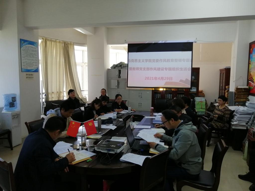 4月29日下午,马克思主义学院在院会议室召开作风教育整顿专题会暨教师党支部作风建设专题组织生活会,会议由党委书记王罡同志主持,全体教师参加了会议。