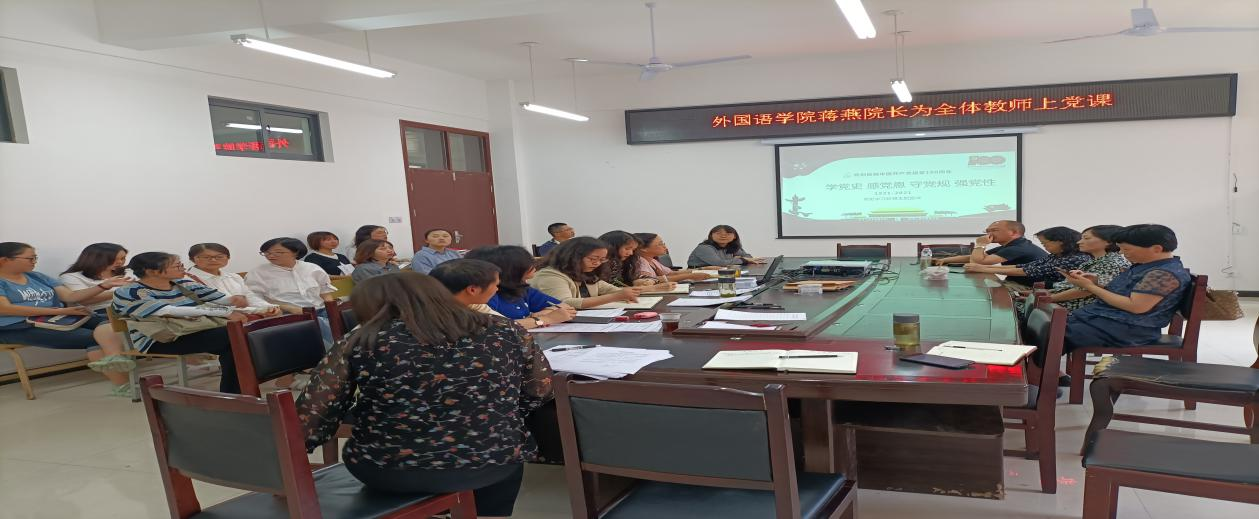 按照中共安顺学院委员会组织部关于印发《关于党史学习教育“十进”基层宣讲“领导干部进支部”宣讲工作的方案》的通知要求,外国语学院党委结合近期工作情况,2021年6月7日下午外国语学院院长蒋燕以“学党史 感党恩 守党规 强党性”为题为全体教职工上党课,全体教职工认真聆听党课。