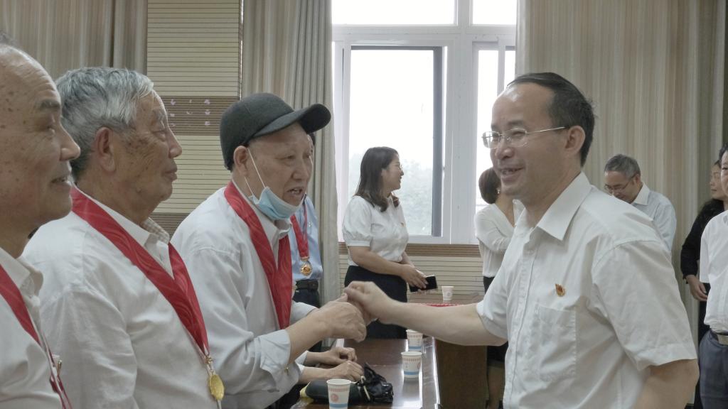 安顺学院党委书记罗荣彬为老党员代表颁发并佩戴“光荣在党50年”纪念章
