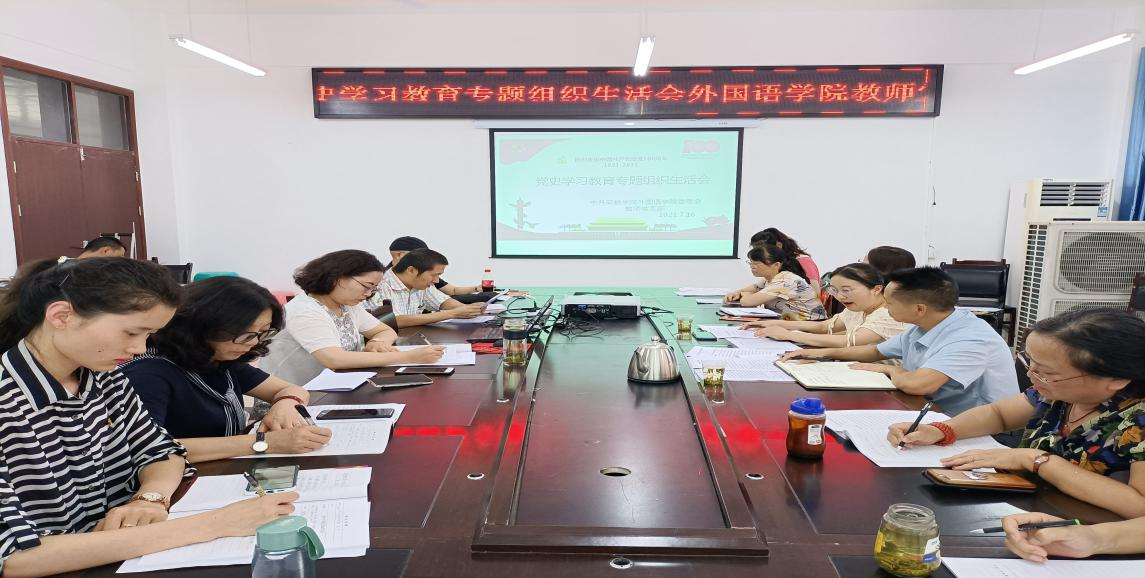 7月16日下午,外国语学院教师党支部召开党史学习教育专题组织生活会,外国语学院党委班子成员以普通党员身份参加此次会议,学校第五巡回指导组周彰波和尚小倩两位同志到会指导。