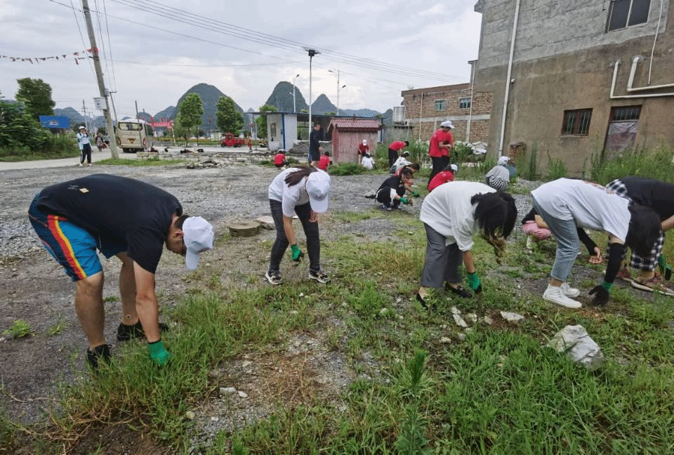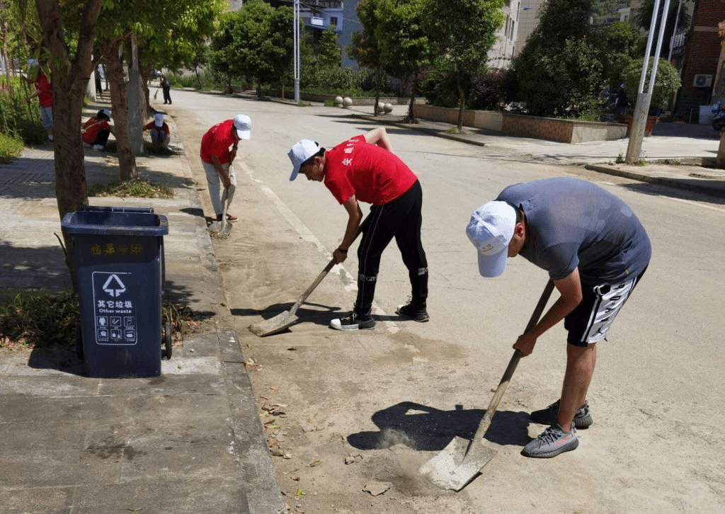 在推进卫生下乡上,实践队与黄鹤营村村民共同进行全面卫生整改,关于下翁弄组周边街道主要进行了排水口的淤泥处理和绿化区域的杂草清除,对于黄鹤营村公共区域的环境卫生主要展开了杂物的整理和杂草清除,实践队队员还协助村民一起对其屋前的不规范放置进行整理。