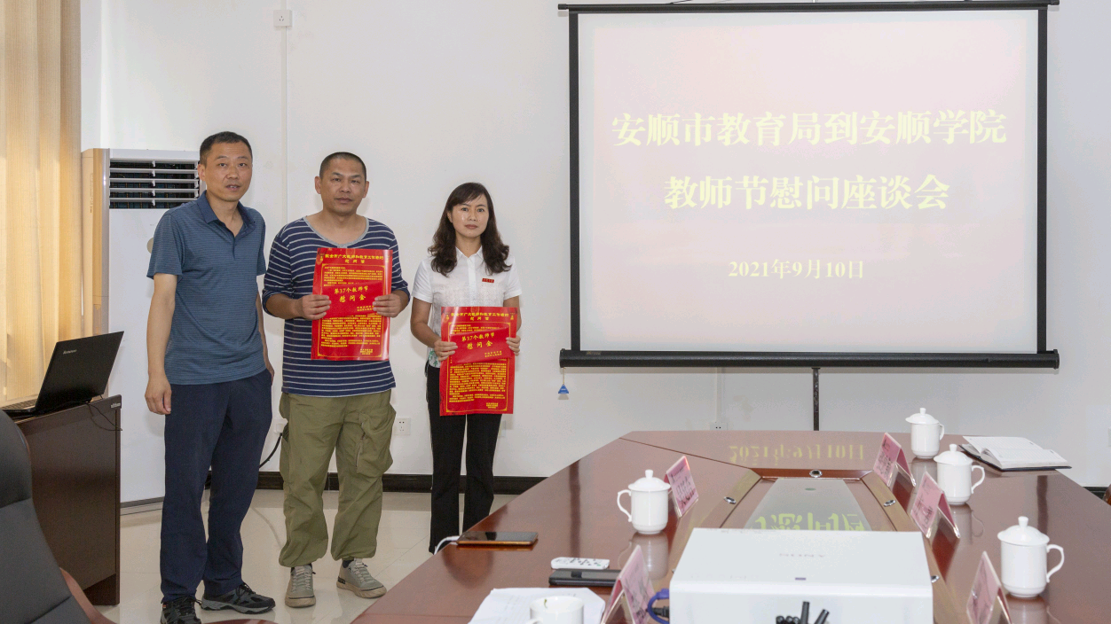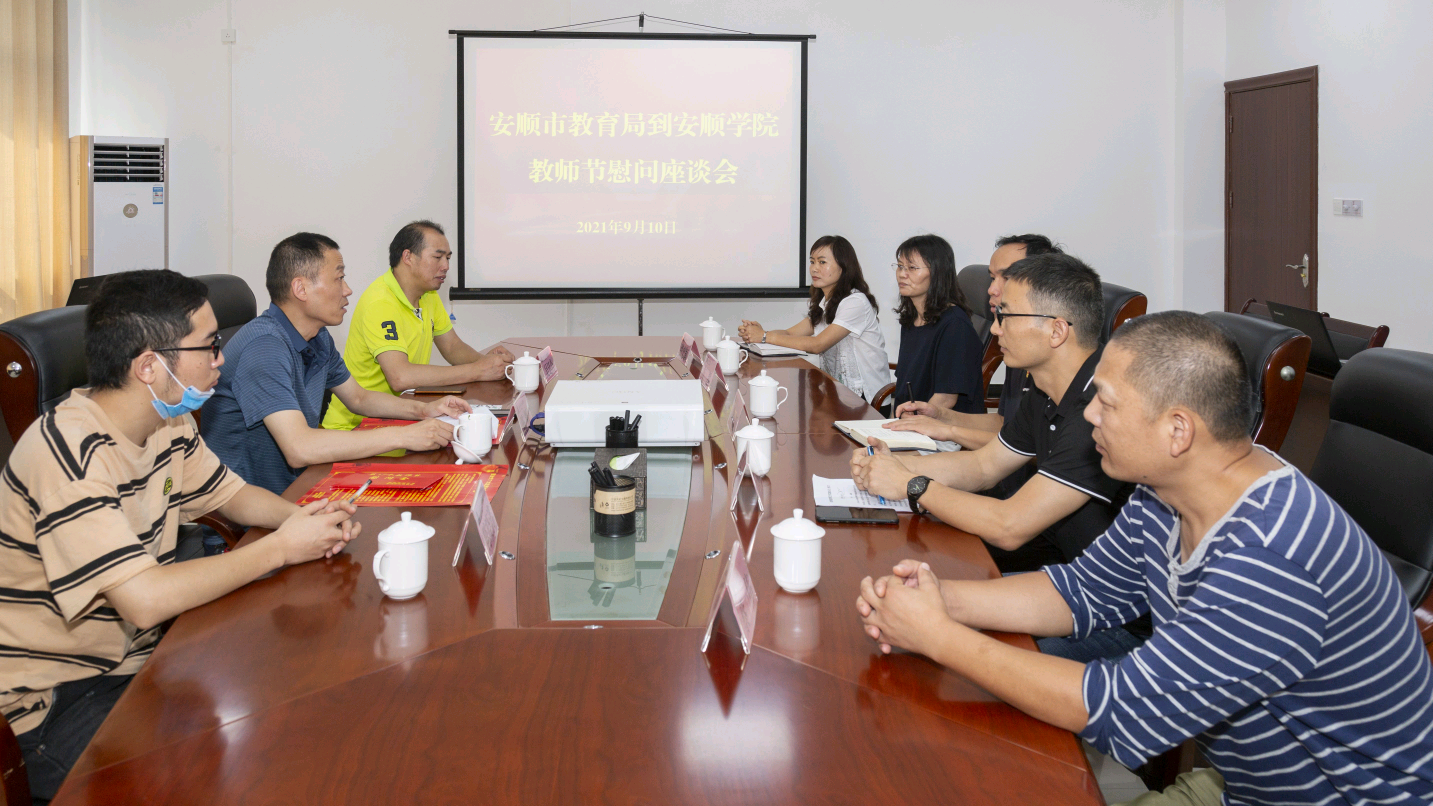 9月10日上午,在第37个教师节到来之际,安顺市教育局领导市教育局考试中心主任陈慨,市教育局考试中招生办主任吴廷合,考试中心工作员陈晓涛一行到我校慰问优秀教师代表。安顺学院人事处处长樊亚、党政办副主任王智勇,教师工作处副处长方曌及优秀教师代表蔡伟、张忠颖参加座谈会。