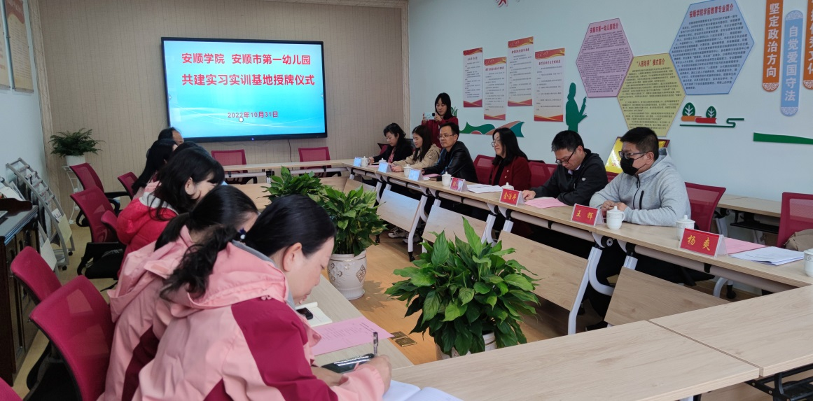 2022年10月31日,安顺学院与安顺市第一幼儿园合作共建教育实践基地验收暨授牌仪式在市第一幼儿园举行。安顺学院教务处副处长彭瑛,教育学院院长邱天龙、副院长余治平及教育学院部分教师代表参加本次验收暨授牌仪式。会议由市一幼教师宋笠主持。