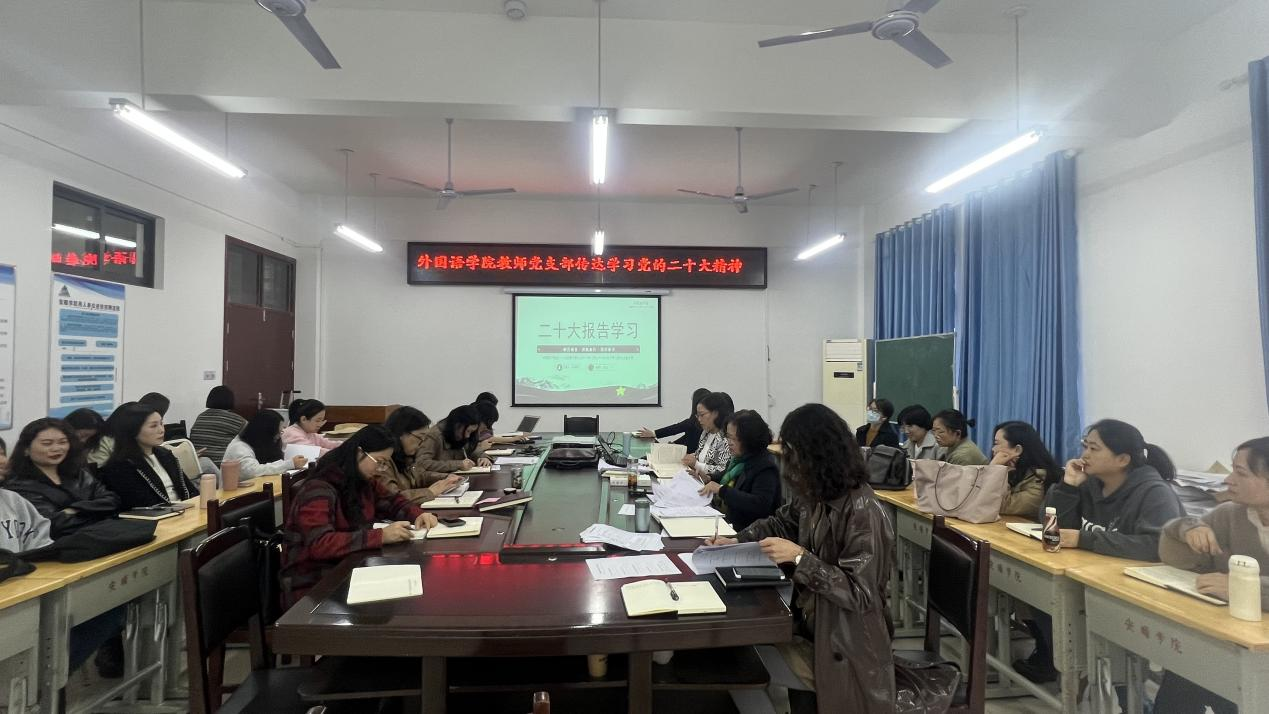 为深入学习贯彻习近平新时代中国特色社会主义思想和党的二十大精神,外国语学院教师党支部于2022年11月7日下午以专题党课的形式开展党的二十大精神的学习。