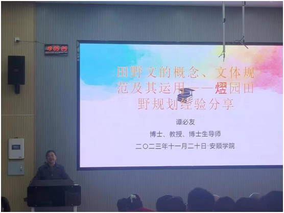 2023年11月20日,安顺学院人文学院邀请湖南师范大学公共管理学院教授、博士生导师谭必友教授作了题为“田野文的概念、文体规范及其运用——熤园田野规划经验分享”的讲座。安顺学院人文社科基地主任孟凡松教授,人文学院部分教师及历史学、文化遗产专业全体学生参加了此次讲座并与谭必友教授进行了交流互动。讲座由人文学院副院长李云根主持。