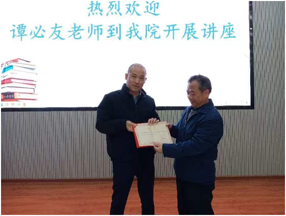 安顺学院人文学院副院长李云根为谭必友教授颁发聘书