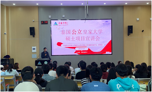 为增强我校学生出国留学意识,帮助学生了解泰国留学相关政策及手续,拓宽就业渠道,尽早做好规划和准备,学校招生与就业指导处、对外交流与合作处于4月1日在安道楼一楼阶梯教室联合举办泰国公立大学留学项目宣讲会。会议邀请中国外文局亚太传播中心伯牙国际合作创新发展中心项目主任邓智超担任主讲人,招生与就业指导处、对外交流与合作处全体人员以及全校有留学意愿的同学参会。