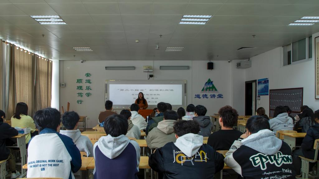 2025年10月24日下午,安顺学院道德讲堂“‘第二个结合’的深刻内涵”专题讲座在特教楼0907教室开展。安顺学院旅游学院党委书记彭瑛主讲,2024级旅游学院学生聆听学习。