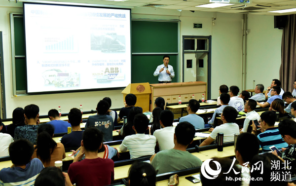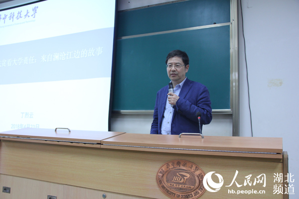 华中科大校长登上讲台,谈从精准扶贫看大学生责任。(周雯 摄)