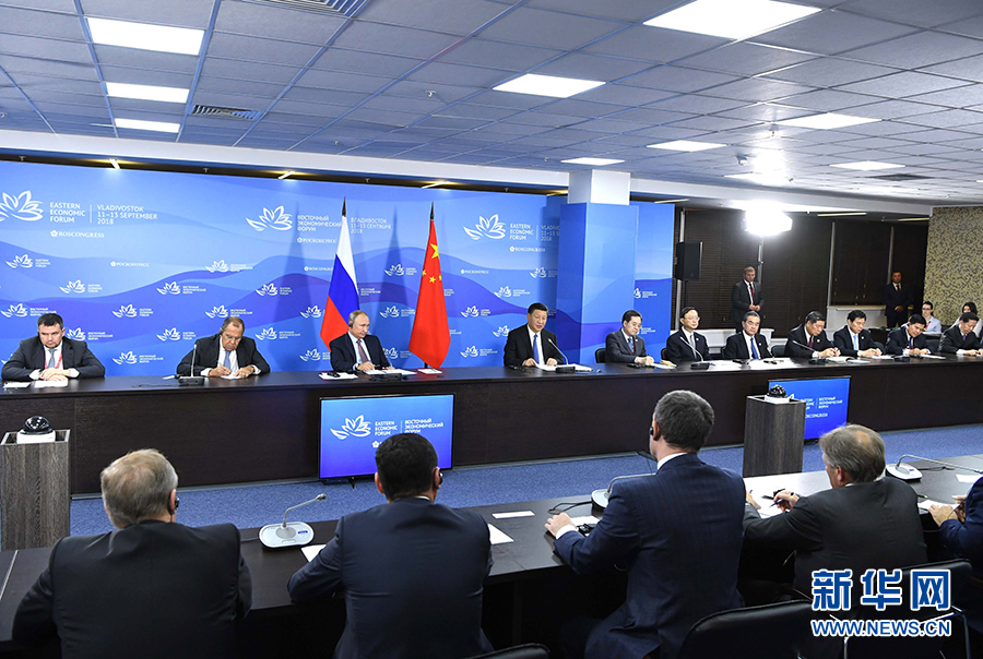 9月11日,国家主席习近平在符拉迪沃斯托克和俄罗斯总统普京共同出席中俄地方领导人对话会。 新华社记者 饶爱民 摄