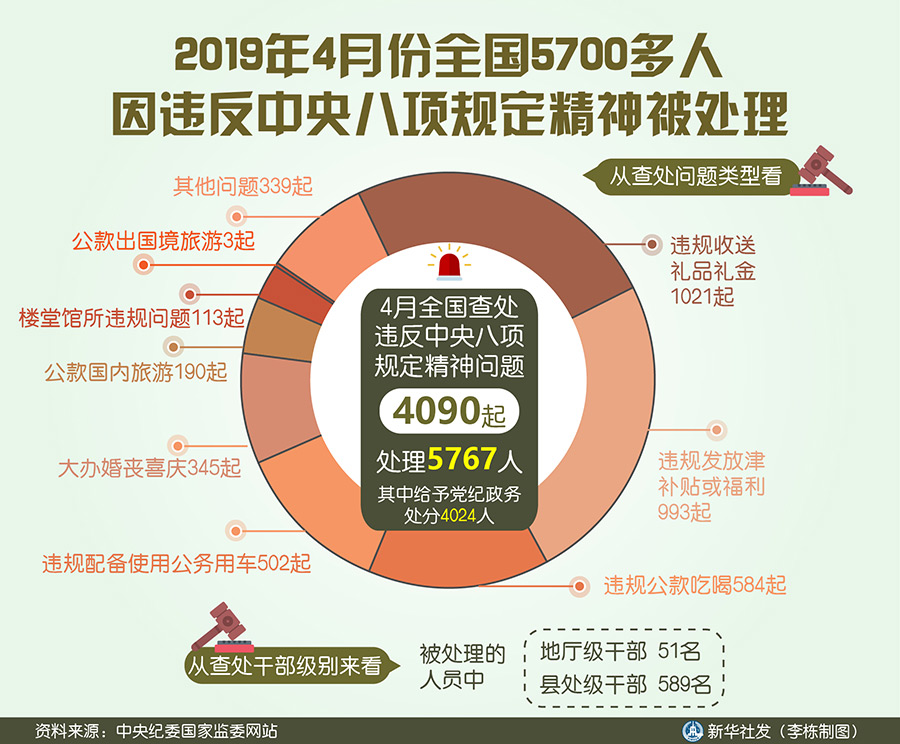 新华社北京5月27日电(记者朱基钗)中央纪委国家监委网站发布数据显示,2019年4月全国查处违反中央八项规定精神问题4090起,处理5767人,其中给予党纪政务处分4024人。