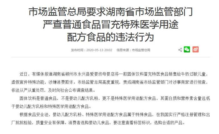 据市场监管总局网站消息,近日,有媒体报道湖南省郴州市永兴县爱婴坊母婴店将一款固体饮料冒充特医食品销售给牛奶过敏儿童,虚假宣传特殊功能,涉嫌消费欺诈。市场监管总局高度重视,责成湖南省市场监管部门对涉事商家进行彻查,依法从严从重处罚,及时向社会公布调查结果。