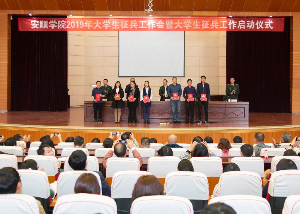 4月8日下午,安顺学院2019年大学生征兵会暨大学生征兵工作启动仪式在学术报告厅举行。安顺学院党委书记罗荣彬、党委副书记陶文彩、副校长令狐荣涛、安顺军分区动员处处长江波、西秀区人武部政委杨蓟出席会议。各二级学院党委书记、院长、副书记,学生科科长、副科长,全体辅导员、班主任;各职能部门主要负责人;学生处(学工部、武装部)、教务处、保卫处、资助管理中心全体同志参加会议。会议由副校长令狐荣涛主持。