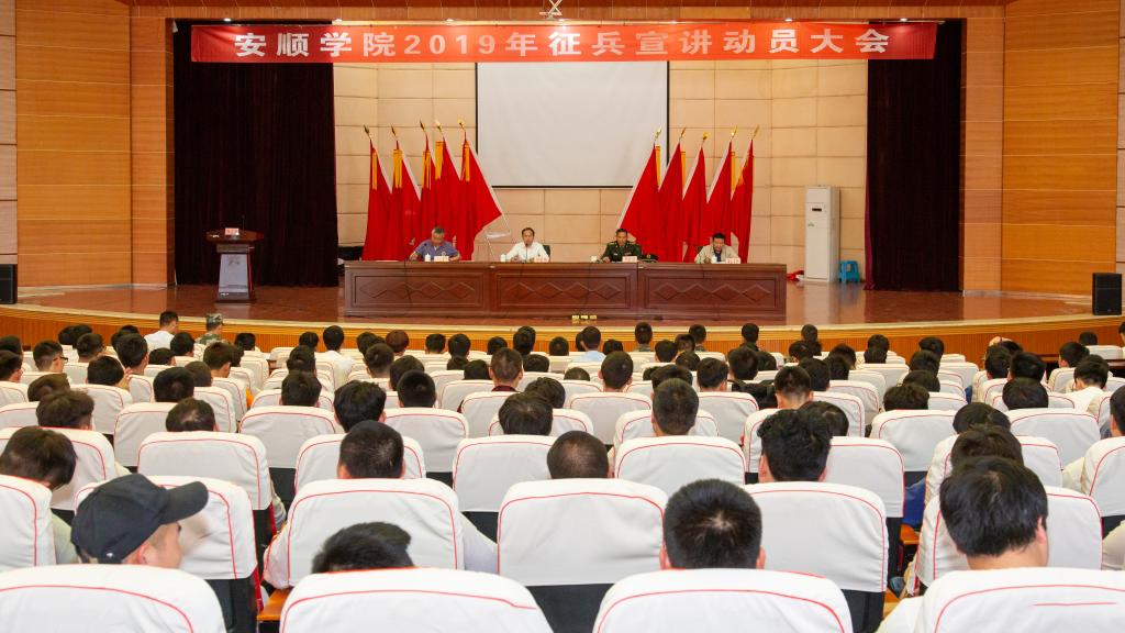 2019年4月22日下午,安顺学院2019年征兵宣讲动员大会在学术报告厅举行。安顺学院党委书记罗荣彬、副校长令狐荣涛,安顺军分区司令员李春虎、动员处处长江波,市教育局调研员程捷和西秀区人民武装部部长郭宝峰出席大会。军分区、西秀区人武部其他同志,校学工部(武装部)有关同志,我校退役复学大学生及学生代表近700人参加会议。会议由令狐荣涛副校长主持。